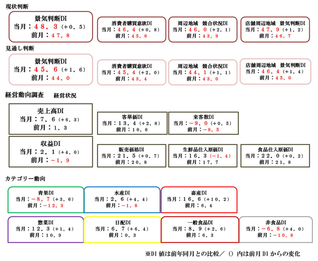 カテゴリー動向調査では、土曜日が一回多いことを追い風に全カテゴリーでDIが前月を上回る動きとなった。前年からの相場安により青果は低迷しているものの、牛肉に回復傾向がみられた畜産や惣菜、日配・一般食品が堅調な推移となった。