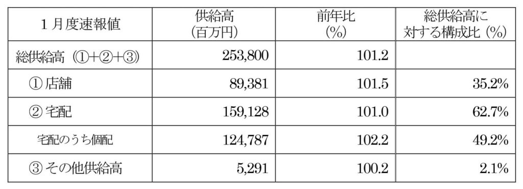 〇1月度の総供給高は、101.2%で前年超えとなりました。