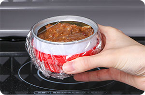 従来の缶詰を温めて食べる場合、お皿など別の容器に移して電子レンジで温める方法が主流とされてきましたが、「レンジde缶®」は、缶のフタを外しラップをかけるだけで簡単に電子レンジで加熱することが可能です。