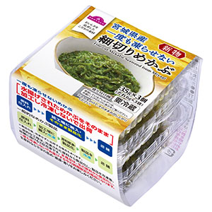 特 長:生原料をそのまま加工し、一度も冷凍していないため、めかぶ本来の鮮やかな色目、食感が味わえます。エリア限定・期間限定商品です。