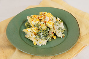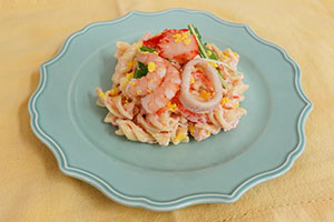 明太子チーズ風味のパスタに、いか、海老、かに風味かまぼこ、卵そぼろを贅沢にトッピングした、彩り鮮やかな人気のディッシュサラダです。