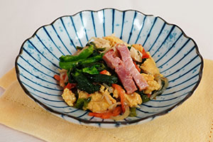 夏の定番ゴーヤチャンプルーを春仕様に仕立てました。豆腐、もやし、たまねぎ、にんじんを溶き卵で炒めた旨味たっぷりのチャンプルーに、彩りのよい菜の花とベーコンを加えました。食卓が華やぐ一品です。