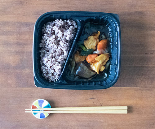 黒酢のまろやかな酸味が食欲をそそり、もちもちとした寝かせ玄米®の食感と調和。主食・主菜・野菜を一度に楽しめる、バランスのよいワンプレートに仕上げています。