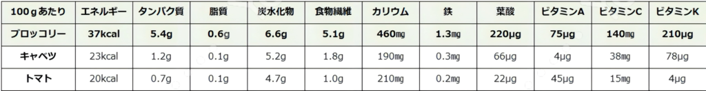 ブロッコリーは、食物繊維やカリウム、鉄、葉酸など多くの栄養素がキャベツやトマトと比較して多いことがわかっています。