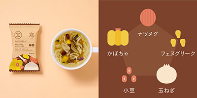 寒がり、夏でも温かいものが好きな方におすすめ。ホクホク食感の和漢素材とかつおだしの旨味が特長のフリーズドライスープ。玉ねぎ・小豆・かぼちゃ・葛・フェヌグリーク・ナツメグを使用。*香辛料に含む