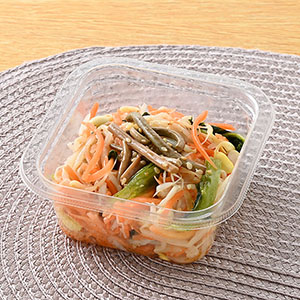 【内容】大豆もやし・切干大根・小松菜・人参・ゼンマイを使用し、ごま油や鶏ガラスープで味付けしました。食感が良く、シンプルな味わいのナムルです。