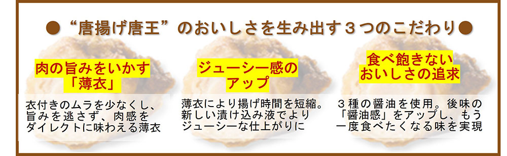 香ばしい香りと旨みを引き出す粉末醤油をブレッダー粉に加え、衣そのもののおいしさがアップしました。ひと口目から香ばしい風味が広がる、“衣からおいしい唐揚げ”に仕上げています。
