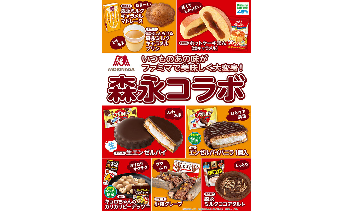 株式会社ファミリーマートは、2026年9月に創立45周年を迎えます。継続して取り組んできた5つのキーワードを土台とし、「いちばんチャレンジ」を合言葉に活動をしていきます。このたび「いちばんおいしい」を目指した取り組みの一環として、森永製菓株式会社(本社:東京都港区、代表取締役社長COO:森信也)とのコラボスイーツを8種類発売する「森永コラボ」キャンペーンを、2026年4月14日(火)から全国のファミリーマート約16,400店にて実施いたします。
