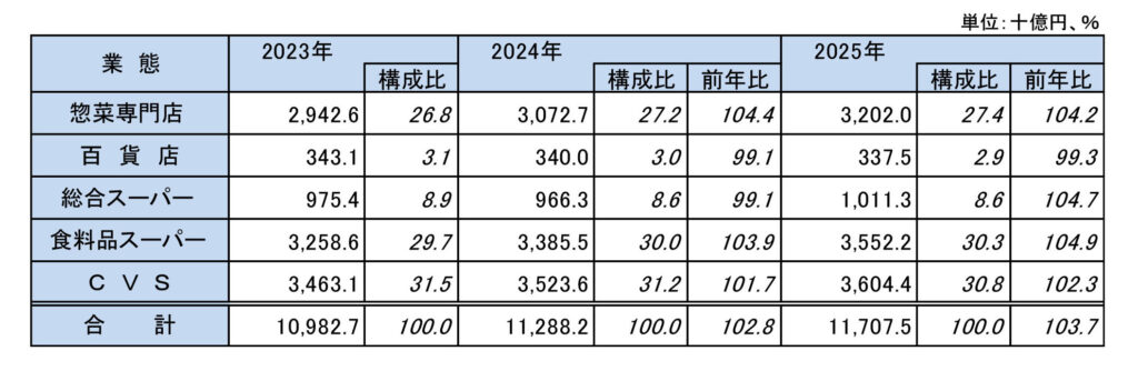 業態別に見ると、CVSが3兆6,044億円(構成比30.8%)と継続的に大きな市場規模を維持してきたが、伸び率は低迷している。一方で、食料品スーパーが104.9%、総合スーパーが104.7%と、スーパーマーケット業態が拡大し、市場をけん引した。惣菜専門店も3兆2,020億円、104.2%と着実に成長している。