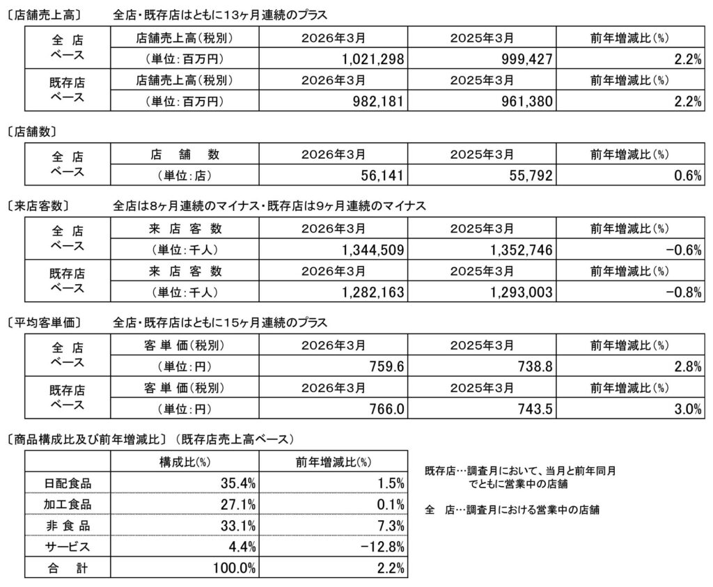 今月は、販促施策や行楽需要により、揚げ物・カウンターコーヒー・ソフトドリンク等が好調に推移したことから、全店・既存店ともに売上高が前年を上回る結果となった。