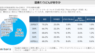 トレンド 【うどんに関する調査】「うどん」を食べる頻度は週1以上が3割で、月1以上だと8割超えの人気!米高騰や猛暑が背景か!? 2割が「最近、食べる頻度が増えた」と回答株式会社mitoriz(本社:東京都港区、代表取締役社長:原田光幸)は、消費者購買行動データサービス「Point of Buy®(以下、POB)」の会員2,993人を対象に「うどんに関する調査」を実施... 2025.09.24 トレンド